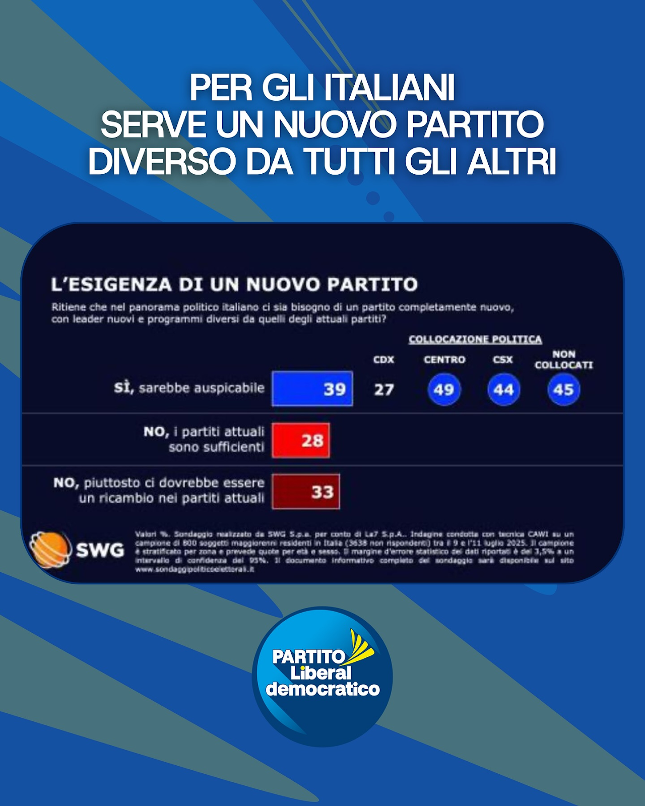 Secondo un recente sondaggio SWG, quasi 4 italiani su 10 ritengono inadeguata l’attuale offerta politica (link). Non cercano l’ennesima lista civetta o un rimpasto del passato: vogliono idee nuove, competenza e concretezza.