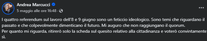 La nostra posizione è chiara: i quattro quesiti sul lavoro guardano al passato, non al futuro e per questo SIAMO CONTRARI (LINK) Lo ha sottolineato anche Andrea Marcucci, annunciando che ritirerà solo la scheda sulla cittadinanza per votare SÌ convintamente.