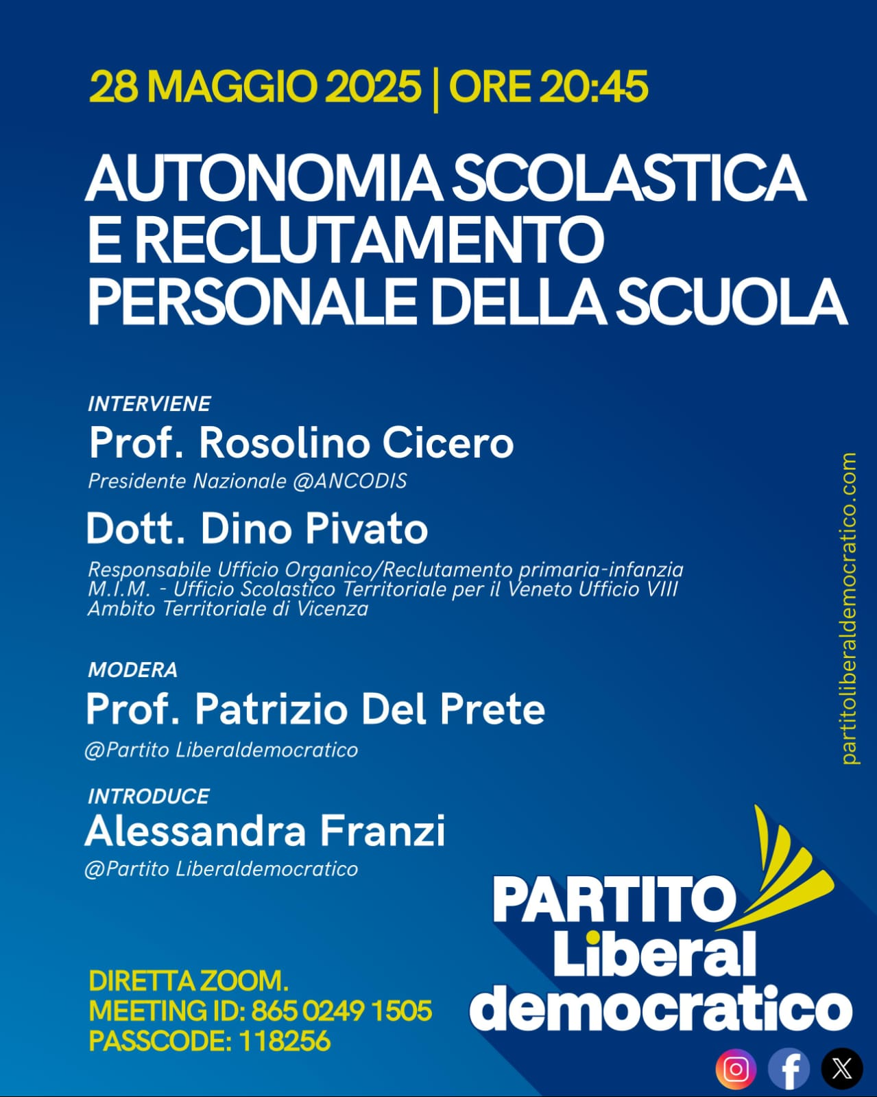 Il 28 maggio alle 20:45 si terrà in diretta Zoom l’incontro "Autonomia scolastica e reclutamento del personale della scuola", promosso dal Forum Scuola del Partito Liberaldemocratico. Interverranno il prof. Rosolino Cicero, presidente nazionale di ANCODIS, il dott. Dino Pivato (UST Veneto), Patrizio Del Prete e Alessandra Franzi.